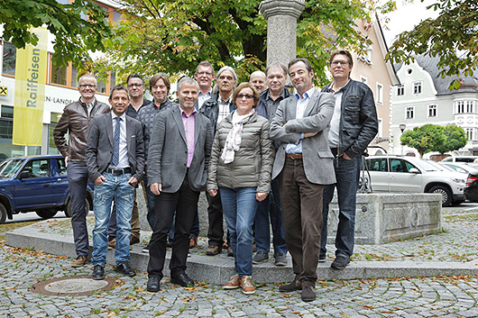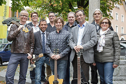 Am Stadtplatz, dem legendären Konzertplatz in Imst (v.l. vorne): Christian Schöffthaler (Kurzschluss), Walter Haid (Raiffeisen-Club), Andrea Bubik-Schöpf (Obfrau Art Club Imst), Werner Klinger (Odds & Ends). v.l.hinten: Roman Polak (Jukebox), Andy Leitner (Bändhaus), Frank Posch (Frank'n'Free), Fränk Reiter (Raiffeisen), Peter Juen (Frank'n'Free), Albert Höllrigl (Odds & Ends), Günther Hallama (Art Club), Guido Walch (Art Club). Foto: Melitta Abber |