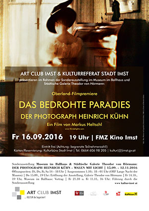 Die Oberland Premiere des Films „Das bedrohte Paradies - Der Photograph Heinrich Kühn“ ist am 16.09.2016 um 19 Uhr im FMZ Kino in Imst zu sehen und auch auf DVD erhältlich. Eine Kurzfassung dieses Film wird während der gesamten Ausstellungsdauer im Museum im Ballhaus gezeigt. Das Zusammenwirken von Ausstellung und Film ermöglicht eine innovative und neuartige Präsentation dieses wichtigsten Tiroler Fotokünstlers und ergibt einen umfangreichen und vertiefenden Blick auf sein Werk. Eintritt frei.