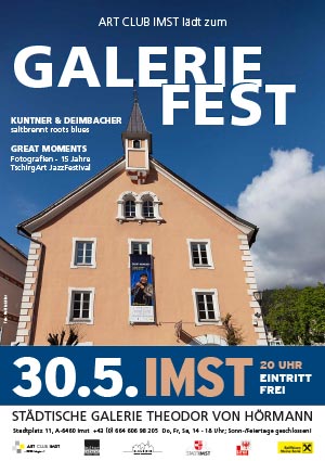 Am Mittwoch, 30. Mai (Vorfeiertag) haben alle Interessierten die Möglichkeit, bei erdigem Blues von Kuntner & Deimbacher („saltbrennt roots blues“) die Ausstellung zu begutachten. Die Heimat der beiden Musiker ist das Tiroler Oberland und der Blues. In der Besetzung Gitarre/blues harp interpretieren sie den „frühen Blues“ auf ihre Weise. Ein Blues, der seinen Wurzeln treu und dem Groove verpflichtet ist. Ein Blues, der erdig und unverfälscht ist und sich zugleich gefühlvoll auf das Wesentliche konzentriert. Das Galeriefest beginnt um 20 Uhr. Der Eintritt ist frei. Die Ausstellung ist weiters zu folgenden Öffnungszeiten zu sehen: Do, Fr und Sa von 14 bis 18 Uhr, Sonn- und Feiertage geschlossen. |