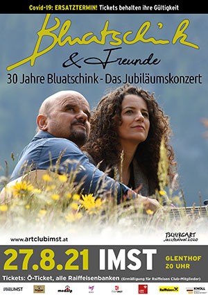Für das Jubiläums-Konzert am 27. August 2021 haben Margit und Toni Knittel Musiker aus dem ganzen Land eingeladen, die in den letzten drei Jahrzehnten irgendwann einmal den Weg von Bluatschink gekreuzt haben. Gemeinsame Auftritte, Festivals und in manchen Fällen auch gemeinsame Studio-Produktionen haben so manche Freundschaft entstehen und so manches Kreativ-Potential erblühen lassen. Oft hat Bluatschink als Vorgruppe anderer Bands das Publikum derart begeistert, dass es bereits vor dem Auftritt der Haupt-Acts „Standing Ovations“ gab. Das brachte den Lechtalern Respekt von vielen Kollegen ein. Das Jubiläumskonzert werden folgende Gäste musikalisch bereichern: Sassy, Astrid & Fred von "Die Seer", Schiffkowitz (STS), Reinhold Bilgeri, Julia Anna, Jamey Garner (High South), K&K Strings und – als besonderes Zuckerl – wird Gründungsmitglied Peter Kaufman auf „A Schalele Kaffee“ vorbeikommen. |