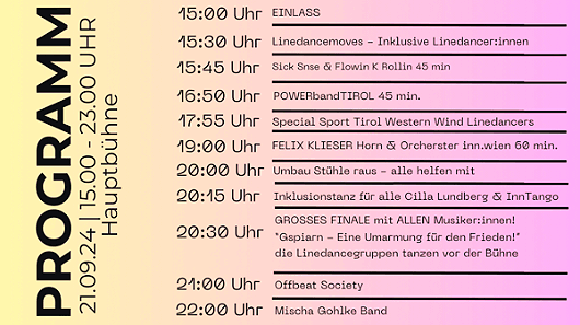 Tickets für das 1. Inklusionsfestival am 21.9.24 in Imst gibt es unter www.powerbandtirol.at und www.artclubimst.at Der Eintritt beträgt 30,00 Euro, Ermäßigungen gibt es für Jugendliche von 14 bis 18 Jahren, für Menschen mit Behinderung, Rollstuhlfahrer und Assistenzpersonen. Kinder bis 14 Jahre zahlen keinen Eintritt.